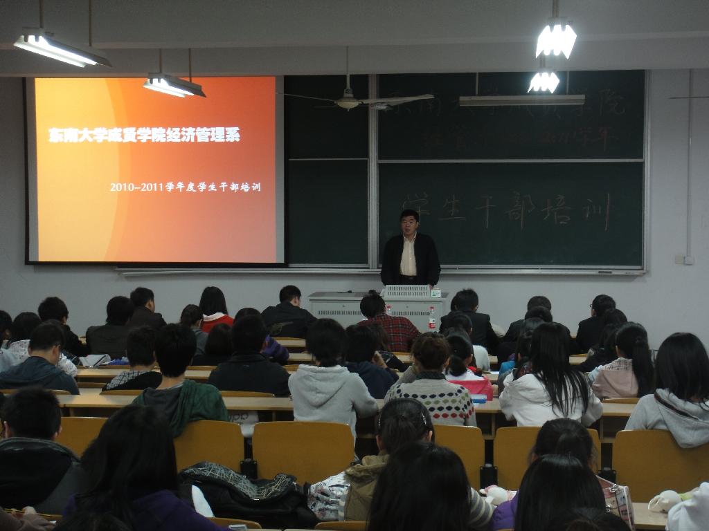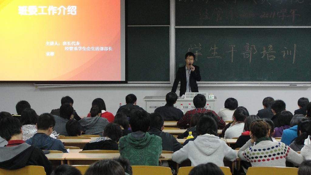 2010年10月25日至27日,为期三天的经济管理系学生干部培训在文昌院403教室顺利举行,08、09级各班班长、团支书、2010级全体学生干部和分团委学生会成员参加了此次培训。此次培训由经济管理系学办主办,系分团委承办。