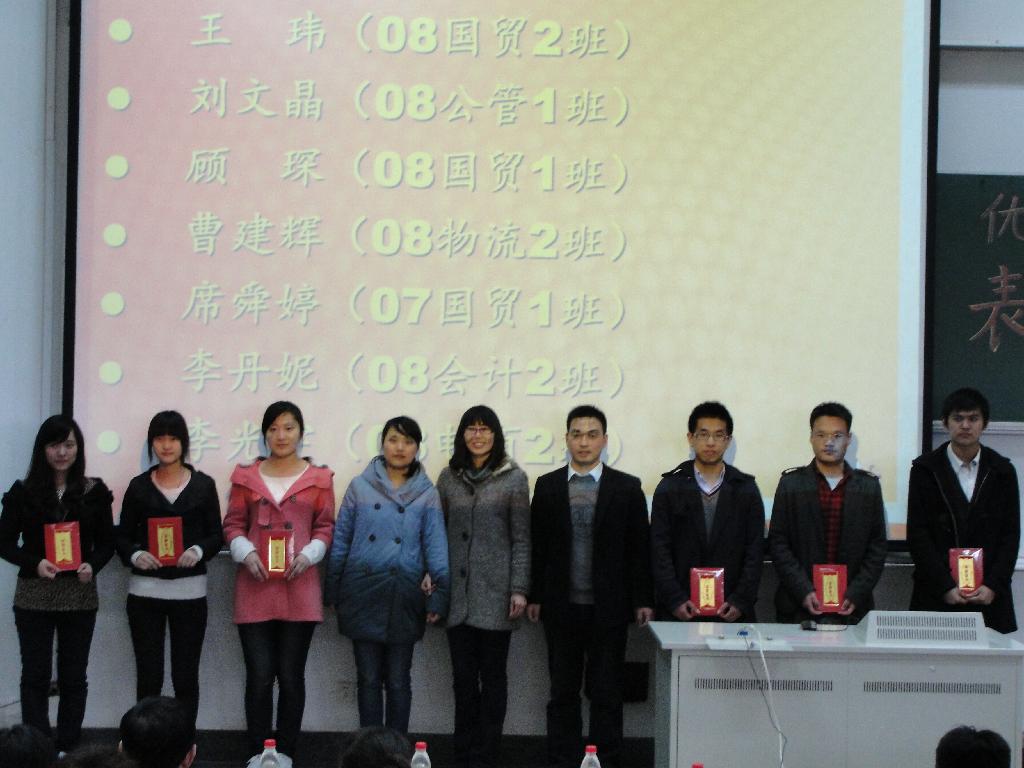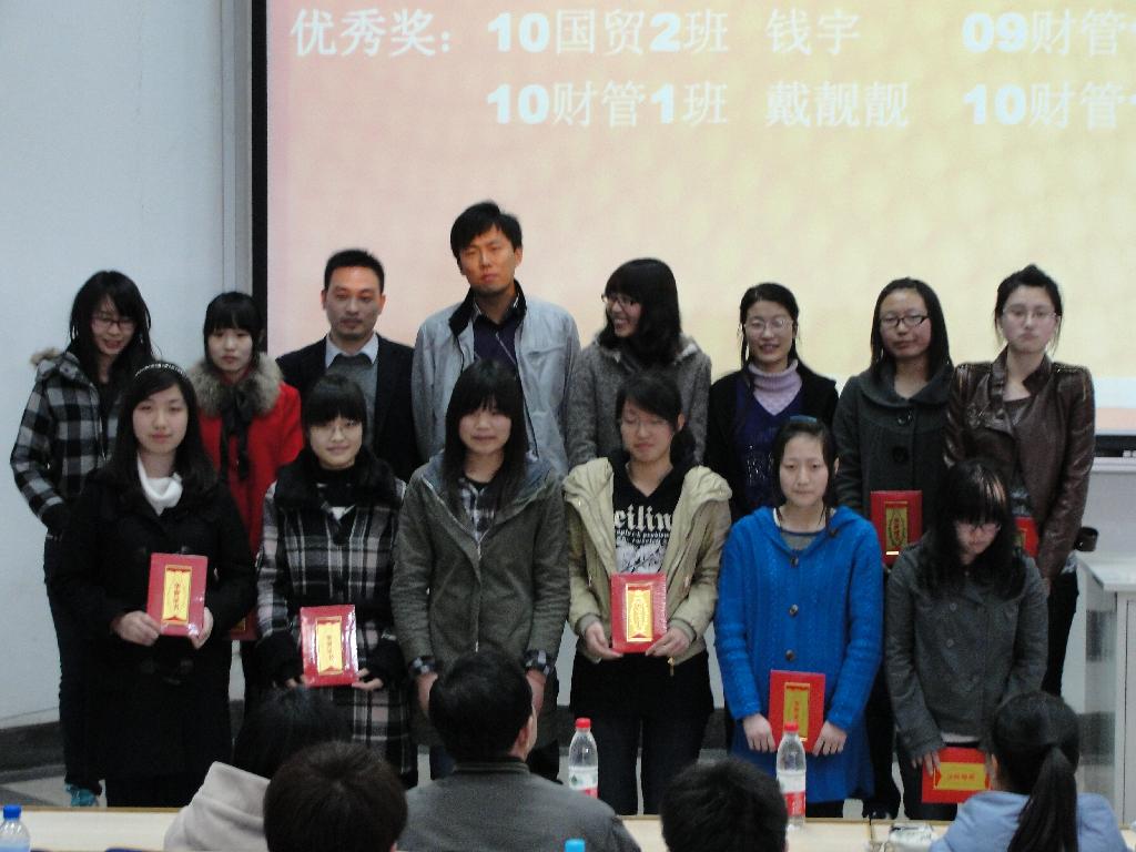 李清源老师首先宣读了《经济管理系2010年度社会活动优秀学生团队表彰决定》,对江苏省第六届创业设计大赛暨模拟沙盘经营(ERP)大赛一等奖的获奖者授予“2010年度ERP团队精英”称号,对江苏省第五届大学生职业生涯规划大赛的获奖选手授予“2010年度职业规划之星”称号。随后,由学生所在班级的辅导员老师亲自为他们颁奖。
