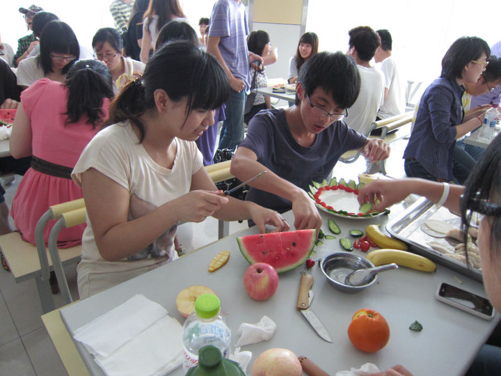 在大家享受热腾腾的饺子的同时,每队相继派代表阐述了水果拼盘作品的寓意与想法。曹润基主席所在的“男人帮”队,将“经管”二字刻在了一圆一方两块西瓜上,方形象征着我们经管人有棱有角,而圆形则代表我们经管人圆润宽容。