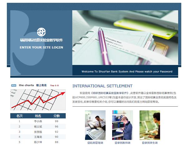 硕研国际结算实验室教学软件主要通过软件模拟银行与贸易商完成国际结算的全流程,帮助学生熟练掌握汇款、托收、信用证三种方式的操作、单据填写,促进学生将结算理论与实务操作相结合,加深理论的理解,提高学生的专业素养。
