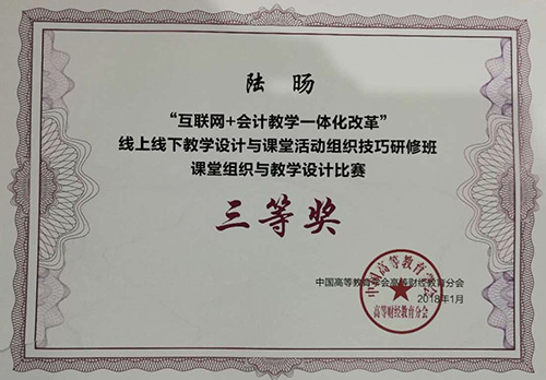 20181月,由中国高等教育学会高等财经教育分会主办的“互联网+会计教学一体化改革线上线下教学设计与课堂活动组织技巧研讨会”在广州举行,全国83所财经类院校共216名专家学者参会。澳门网投官网经济管理学院财务管理专业教研室主任陆旸及财务管理专业青年教师卢颖应邀参加,陆旸老师在团队课赛中获得三等奖。