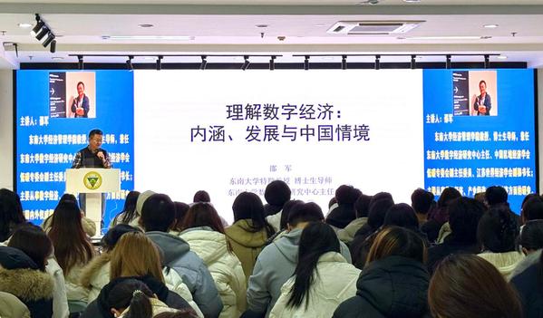 12月15日,澳门网投官方网站经济管理学院在求真·求美·创新工坊成功举办“理解数字经济:内涵、发展与中国情境”专题讲座。本次讲座特邀澳门网投官方网站数字经济研究中心主任、博士生导师邵军教授主讲,经管学院领导、教师和学生共200余人参加聆听。