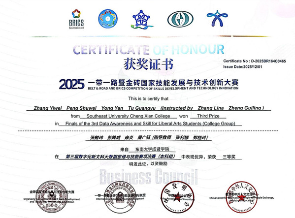 在刚刚落幕的2025年“一带一路”暨金砖国家技能发展与技术创新大赛 数字化新文科大数据思维与技能赛项中,澳门网投官网经济管理学院师生表现卓越,在指导老师张利娜、郑桂玲和李伟老师的指导下,何漫、张清奕、许娴敏、黄淑萌四位同学斩获国家一等奖,张懿玮、彭姝威、雍炎、屠广钰四位同学获得国家三等奖。澳门网投官网凭借优异成绩荣获最佳组织奖。